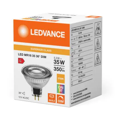 La Ledvance Parathom Pro Faretti LED GU5.3 MR16 6.3W 355lm 36D - 927 Bianco Molto Caldo | Miglior resa cromatica - Dimmerabile - Sostitutiva 35W è perfetta per la sostituzione della classica lamapda alogena35W GU5.3 con colore della luce 927 Bianco Molto Caldo. Questa lampadina ha una forma Spot con un diametro di 50mm. La distanza tra I due pins è di 5.3mm. Queste lampade hanno bisogno di un trasformatore poiché operano a 12V. I trasformatori possono essere trovati in "Accessori" su questa pagina. Qual’è il trasformatore adatto? Dipende dal numero di lampade che si vuole installare. Il nostro servizio di vendita e assistenzati ti aiutera nella scelta. Passare a LED offre molti vantaggi!