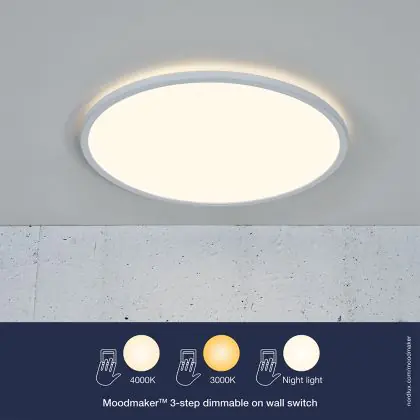 Questa plafoniera Oja di Nordlux dimostra chiaramente che è possibile adattare la luce. Questo apparecchio è dotato di una funzione Moodmaker a tre livelli, che può essere regolata premendo un interruttore. In questo modo si ottengono 3 modalità di illuminazione: